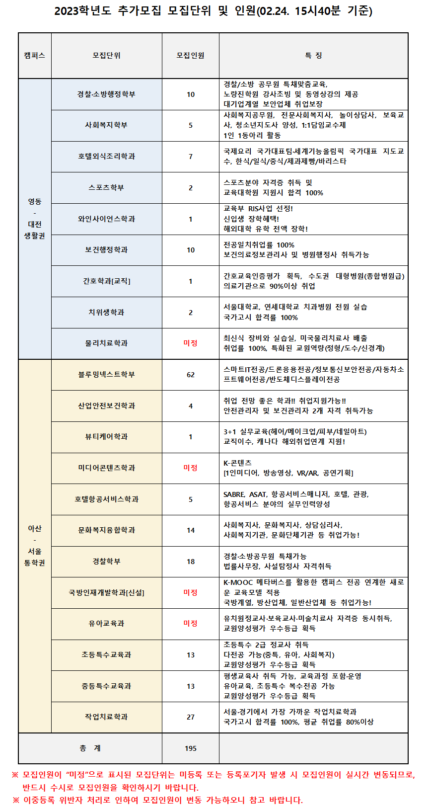 "영동캠퍼스(대전생활권) ↔ 아산캠퍼스(서울통학권) 상호전과 가능"